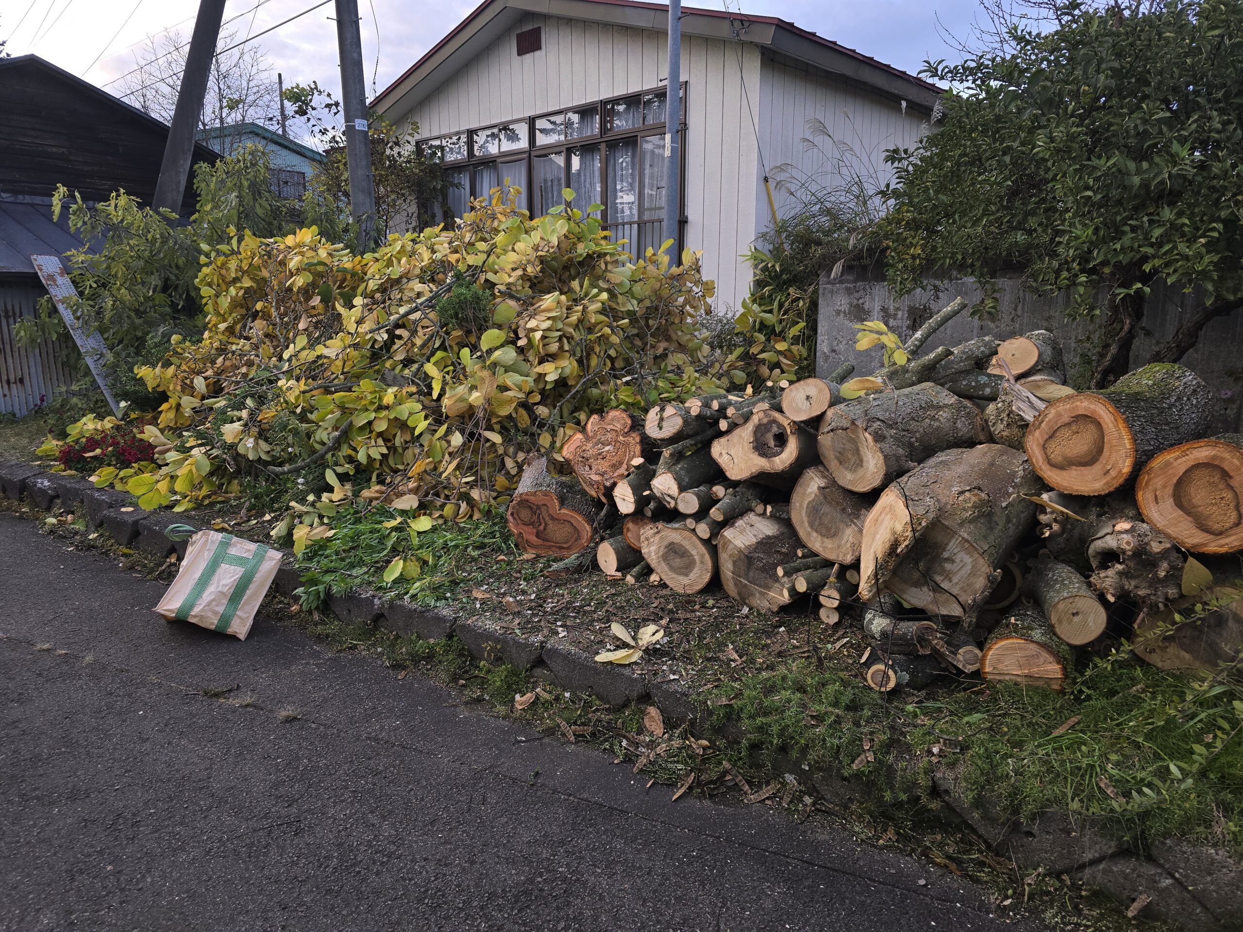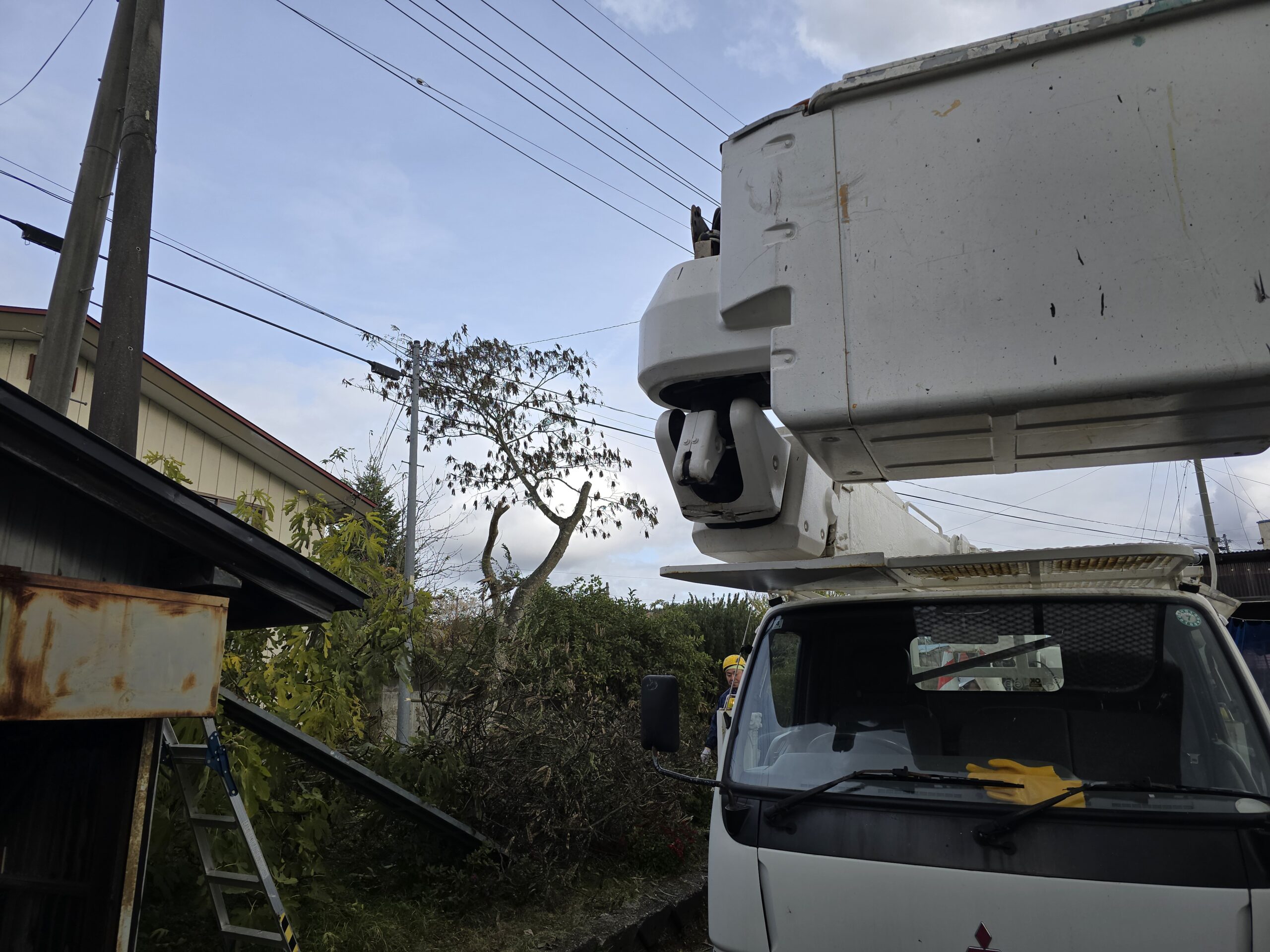 近くに家、小屋、庭木と障害物が多いなかでの高所作業と安全作業を心掛けてます